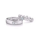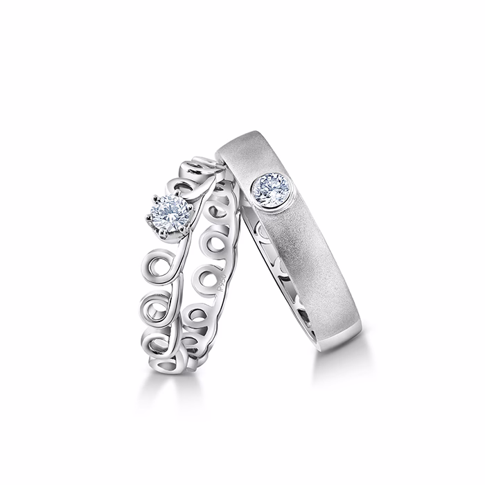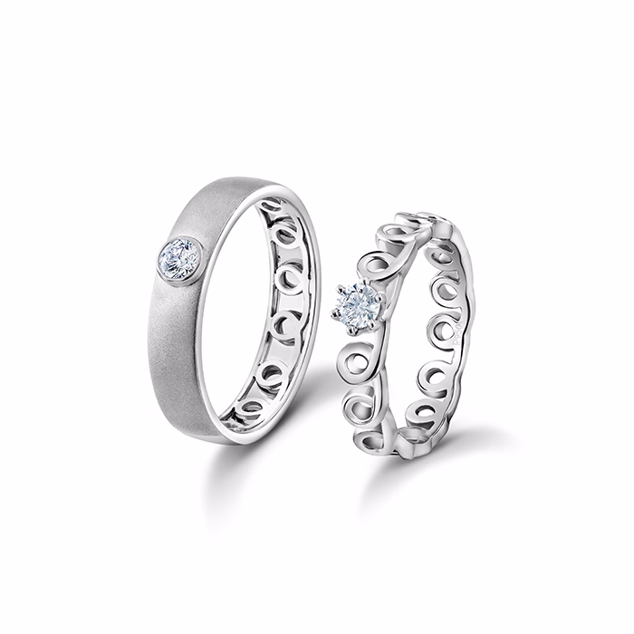 Designed as a flowing spiral for her and a matte-finished band for him, they reflect how two people can be beautifully different, yet perfectly in sync.