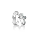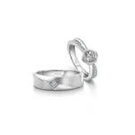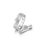 These love bands embody the essence of duality. They combine brushed and glossy textures on his ring, and plain studded finishes on hers, merging into beautiful central motifs that symbolize your love. They perfectly represent your two paths that merge into one cherished space. Cast in a celestial metal that arrived on earth through a meteorite crash billions of year ago, platinum is truly rare. Let these Platinum Love Bands serve as a testament to your unique journey together.