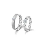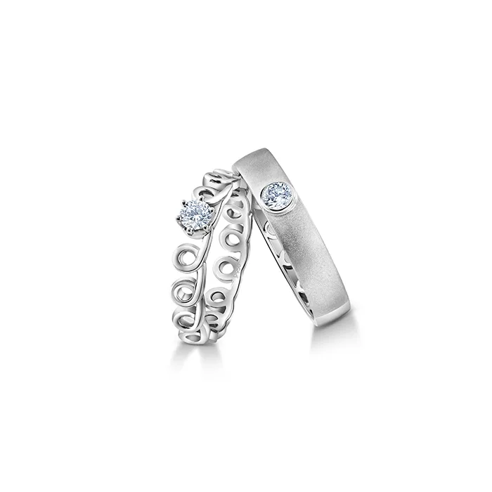 Designed as a flowing spiral for her and a matte-finished band for him, they reflect how two people can be beautifully different, yet perfectly in sync.